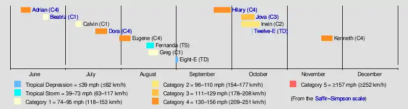 The season got off to an active start with first storm, Adrian, becoming one of only a handful of tropical cyclones to attain Category 4 status in June. Four other storms, Dora, Eugene, Hilary, and Kenneth attained Category 4 status. Dora was the strongest storm of the year, peaking at 155 mph, just short of Category 5 status. The month of August was about average in terms of the number of storms, with the strongest of the month being Eugene. However, the first half of September had very little activity, due to the return of a La Niña event. Tropical Depression Eight-E was the only storm in the first half of September, when it dissipated on September 1.