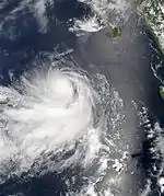 The National Hurricane Center (NHC) began to monitor an area of disturbed weather southwest of the Mexican Riviera in late August. Initially, poorly organized, environmental conditions were conductive for some development.[47] Shortly thereafter, the cloud patterns improved and overall thunderstorm activity increased.[48] Thunderstorm activity become more concentrated two days later while located 60 mi (97 km) south of Zinhuatnejo, and the NHC noted that the disturbance could become a tropical depression within hours.[49] This held true, and at 1500 UTC August 31, the low was upgraded into a tropical depression, but no further intensification was anticipated.[50] Eight-E soon made landfall on Southwestern Mexico, and moved north-northwestwards, as it rapidly weakened. Eight-E dissipated to a remnant low several hours later, early on September 1.[51] However, the remnants of Tropical Depression Eight-E survived, and they as they began moving westward, the remnants impacted Western Mexico. During the early afternoon of September 1, the remnants of Eight-E moved off the western coast of Western Mexico. During the next day, the remnants strengthened slightly in intensity, as it moved northwestward, towards the Baja California Peninsula. But late on September 2, the remnants of Tropical Depression Eight-E dissipated completely, just southeast of the peninsula.