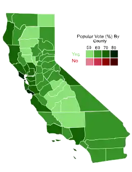 The proposition was passed on November 6, 2012, with 8,575,619 people (69.3%) voting Yes and 3,798,218 people (30.7%) voting No.[24] It passed by a majority in all counties of the state. It was most strongly supported in San Francisco (84.5%), Marin (83.2%), and Alameda (78.6%) counties. Madera county passed it with a slight majority of 52%.[4]