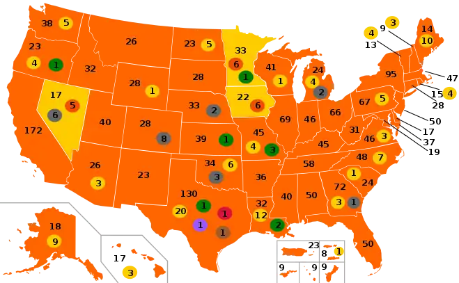 43 AK, AS, AZ, AR, CA, CO, CT, DE, D.C., FL, GU, HI, ID, IL, IN, KY MD, MA, MI, MO, NE, NV, NH, NJ, NM, NY, NC, MP, OH OR, PA, PR, RI, SD, TX, VI, UT, VT, VA, WA WV, WI, WY | |