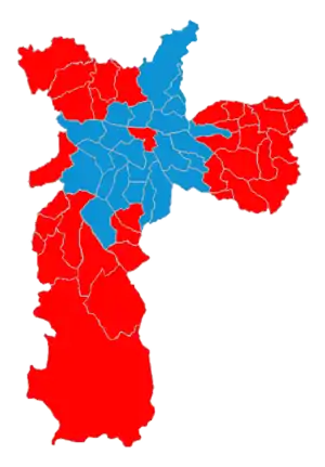 The 2012 São Paulo municipal election took place in the city of São Paulo, with the first round taking place on 7 October 2012 and the second round taking place on 28 October 2012. Voters voted to elect the Mayor, the Vice Mayor and 55 city councillors for the administration of the city. The result was a 2nd round victory for Fernando Haddad of the Workers' Party (PT), winning 3,387,720 votes and a share of 55.57% of the popular vote, defeating José Serra of the Brazilian Social Democracy Party (PSDB), who took 2,708,768 votes and a share of 44.43% of the popular vote.