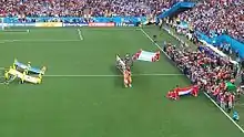 Brazil opened the scoring when from a corner when David Luiz turned Thiago Silva's flick-on into the net with his thigh. While replays suggested that Chilean defender Gonzalo Jara may have had the last touch,[4] FIFA later confirmed that the goal was scored by Luiz, not Jara.[5] Chile equalised when Hulk lost possession after a throw-in in his own half, Eduardo Vargas stole the ball and passed to Alexis Sánchez to score.[6]