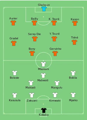 | Bony Tallo Aurier Doumbia Y. Touré Kalou K. Touré Kanon Bailly Die Barry |
