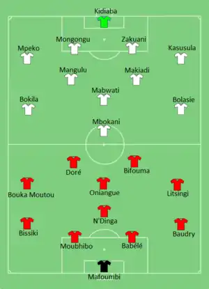 Congo took the lead in the 55th minute, when Férébory Doré met Delvin N'Dinga's free kick to slot home. They increased the lead seven minutes later, when after they intercepted a DR Congo pass out of the defence, Thievy Bifouma scored from the rebound after Doré's shot was saved. DR Congo pulled a goal back in the 65th minute, when Dieumerci Mbokani converted from Yannick Bolasie's cross. The equalizer came ten minutes later when Jeremy Bokila scored from Cédric Makiadi's pass. DR Congo took the lead when Joël Kimwaki headed in Neeskens Kebano's free kick in the 81st minute, and completed the comeback after Mbokani converted his own rebound to score his second goal of the match in the first minute of injury time. This put them in the semi-finals for the first time since 1998.[1][2]