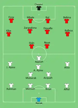 Ghana took the lead in the 42nd minute through Jordan Ayew's penalty, awarded after Kwesi Appiah was fouled by Felipe Ovono. In the first minute of first half injury time, Wakaso Mubarak finished Christian Atsu's pass in a counter-attack to double Ghana's lead. Ghana's third goal was scored by André Ayew from a cross by Appiah in the 75th minute. The win put the Ghanaians into a record ninth Africa Cup of Nations final.[17][18]
