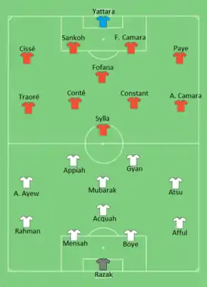 Ghana took the lead in the 4th minute, after André Ayew back-heeled the ball for Christian Atsu to convert from close range. Ghana increased the lead in the 44th minute, as Kwesi Appiah intercepted a missed pass from the Guinea defence to score. Atsu scored his second goal of the match in the 61st minute, when he received the ball from Wakaso Mubarak on the right flank, cut inside and curled the ball into the net. Guinea goalkeeper Naby Yattara was sent off in the fourth minute of injury time for bringing down Asamoah Gyan outside the penalty box. Ghana's win sent them to the semi-finals for the fifth consecutive tournament.[8][9]