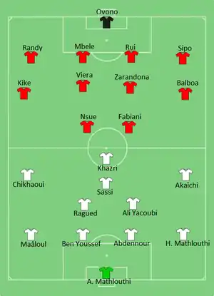Tunisia took the lead in the 70th minute, when Ahmed Akaïchi flicked in Hamza Mathlouthi's cross from the right. Equatorial Guinea scored the equalizer in the third minute of injury time through Javier Balboa's penalty, which was awarded after Hamza Mathlouthi was ruled to have fouled Iván Bolado. The match went to extra time, and Balboa scored the winning goal in the 102nd minute with a direct free kick, sending the hosts to their first ever semi-finals.[4][5] The match had witnessed controversies regarding the Mauritian referee's bias refereeing in favor to the host nation, including the controversial penalty in the final minutes, resulting with Tunisian players attacking him in the end of the game. CAF decided to ban the referee for life as for the result.[6]