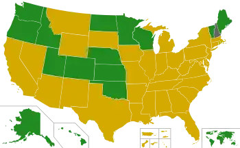 1846 / 4051 (46%) | 23 AK, CO, DA, HI, ID, IN, KS, ME, MI, MN, MT, NE,[lower-alpha 7] NH, ND, OK, OR, RI, UT, VT, WA,[lower-alpha 8] WI, WV, WY[lower-alpha 6] |