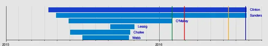 A total of six major candidates entered the race starting April 12, 2015, when former Secretary of State and New York Senator Hillary Clinton formally announced her second bid for the presidency. She was followed by Vermont Senator Bernie Sanders, former Governor of Maryland Martin O'Malley, former Governor of Rhode Island Lincoln Chafee, former Virginia Senator Jim Webb and Harvard Law Professor Lawrence Lessig. A draft movement was started to encourage Massachusetts Senator Elizabeth Warren to seek the presidency, but Warren declined to run, as did incumbent Vice President Joe Biden. Webb, Chafee, and Lessig withdrew prior to the February 1, 2016, Iowa caucuses.[2][3]