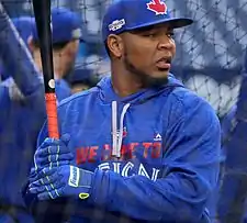 Shortly after pitchers and catchers reported to Dunedin for the start of spring training on February 22, José Bautista addressed the media regarding his contract situation. Bautista, in the final year of a five-year, $65 million contract, stated that he had told the Blue Jays the length of contract he was seeking as well as the compensation of said contract, and that he would not negotiate or agree to a "hometown discount".[48] The following day, TSN's Rick Westhead reported that Bautista had requested a five-year, $150 million contract.[49] The report was later refuted by Bautista.[50] While Bautista's contract situation was unfolding, the Blue Jays, Los Angeles Angels of Anaheim, and Cincinnati Reds were reported to be in agreement on a trade that would have sent Michael Saunders to the Angels, Jay Bruce to the Blue Jays, and unnamed prospects from the Angels and Blue Jays to the Reds. Hours after the trade was made public, reports surfaced that the deal was on hold due to issues with an unknown player's physical.[51]