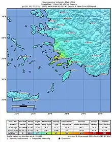 A magnitude 6.6 earthquake struck on 21 July 2017, about 10 km (6.2 mi) south southeast of Bodrum, Turkey, at depth of 7.0 km. Two people were killed and more than 120 others were injured on the Greek island of Kos, while at least 360 injuries were reported in Turkey.[1][2][3][4]