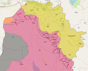 The 2017 Iraqi–Kurdish conflict, also known as the Kirkuk Crisis,[20][21] was a conflict in which the Iraqi government retook disputed territories in Iraq which had been held by the Peshmerga since ISIL's Northern Iraq offensive in 2014. The conflict began on 15 October 2017 after tensions arising from the Kurdistan Region independence referendum of 25 September. The tension between the federal Iraqi government and Kurdistan Region escalated into conflict when the Peshmerga ignored repeated warnings to return Kirkuk to Iraqi government forces.[22] Part of the conflict was the Battle of Kirkuk, when Iraqi forces regained control of the city.
