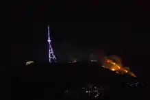 A fire at Mount Mtatsminda in Tbilisi on 8 August 2017. Wildfires rage in many parts of Georgia, especially the Borjomi Gorge, throughout August 2017.[48]