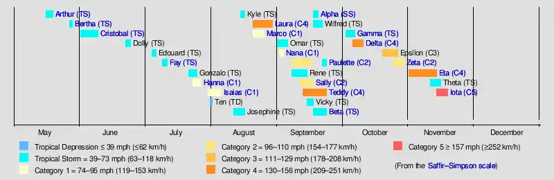 The season officially started on June 1 and officially ended on November 30. However, storm formation is possible at any time of the year, as demonstrated in 2020 by the early formation of Tropical Storms Arthur and Bertha, on May 16 and 27, respectively. This marked the record sixth consecutive year with a pre-season system. The first hurricane, Hurricane Hanna, made landfall in Texas. Hurricane Isaias formed on July 31, and made landfall in The Bahamas and North Carolina in early August, both times as a Category 1 hurricane; Isaias caused $4.8 billion in damage overall.[nb 2] In late August, Laura made landfall in Louisiana as a Category 4 hurricane, becoming the strongest tropical cyclone on record in terms of wind speed to make landfall in the state, alongside the 1856 Last Island hurricane.[3] Laura caused at least $19 billion in damage and 77 deaths. September was the most active month on record in the Atlantic, with ten named storms. A slow-moving Hurricane Sally impacted the US Gulf Coast, causing severe flooding. The Greek alphabet was used for only the second time, starting with Subtropical Storm Alpha, which made landfall in Portugal. On the last day of October, Hurricane Eta formed and made landfall in Central America at Category 4 strength on November 3.[4] Eta ultimately led to the death of at least 189 people and caused $7.9 billion USD in damage. Then, on November 10, Tropical Storm Theta became the record-breaking 29th named storm of the season and, three days later, Hurricane Iota formed in the Caribbean. It rapidly intensified to Category 5 intensity on November 16, the latest Category 5 hurricane on record in the Atlantic Ocean. This also made 2020 the only recorded season with two major hurricanes in November.[5] Iota ultimately made landfall in the same general area of Central America that Eta had just weeks earlier and caused catastrophic damage.