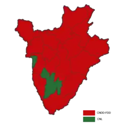 ![]() Presidential election results map. Red denotes provinces won by Ndayishimiye, and Green denotes those won by Rwasa. | |||||||||||||||||||||