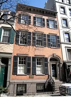 203 Prince Street is an historic townhouse on Prince Street between MacDougal and Sullivan Streets in the SoHo neighborhood of Manhattan, New York. Built in 1834 with 2 1/2 stories on land that was once part of the estate of Aaron Burr, the house acquired an additional full story in 1888.[2] Primarily constructed in the late Federal style, the building also has elements of the Greek Revival style.[3][4]