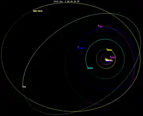 Gonggong orbits the Sun at an average distance of 67.5 AU (1.010×1010 km; 6.27×109 mi), and completes a full orbit in 554 years.[3] The orbit of Gonggong is highly inclined to the ecliptic, with an orbital inclination 30.7 degrees.[3] Its orbit is also highly eccentric, with a measured orbital eccentricity of 0.50.[3] Due to its highly eccentric orbit, the distance of Gonggong from the Sun varies greatly over the course of its orbit, from 101.2 AU (1.514×1010 km; 9.41×109 mi) at aphelion, its furthest point from the Sun, to around 33.7 AU (5.04×109 km; 3.13×109 mi) at perihelion, its closest point to the Sun.[3][1] Gonggong reached perihelion in 1857, and is currently moving farther from the Sun, toward its aphelion.[46]