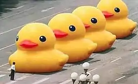 Use of internet memes have become the favourite way of circumventing censorship. Following the appearance in a parody of "Tank Man" on Sina Weibo inspired by The Rubber Duck Project that took Hong Kong by storm, the term big yellow duck was also blocked.[13] Another one that briefly got through censorship under cover of International Children's Day was a reconstruction of "Tank Man" using LEGO bricks on NetEase.[10][14]