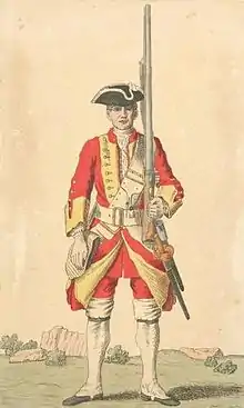 The regiment embarked for the North American colonies in 1767, to take up garrison duties.[39] On the outbreak of hostilities in the American War of Independence, in 1775, the 26th Foot were stationed in Lower Canada along with the 7th Royal Fusiliers; the two regiments were loosely scattered among frontier posts, and both were at a very low strength, mustering around seven hundred men between them.[41]