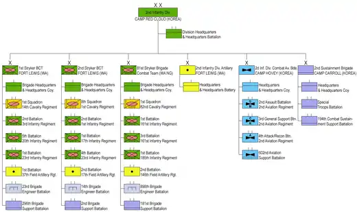 Denoted the 2nd Infantry Division-ROK/U.S. Combined Division, the division is augmented by rotational BCTs from the rest of the U.S. Army's divisions.[5]