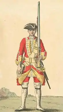 On 1 July 1751 a royal warrant was issued declaring that in future regiments were no longer to be known by their colonel's name, but by the "Number or Rank of the Regiment". Accordingly, Colonel the Earl of Loudoun's Regiment was renamed as the 30th Regiment of Foot.[1] The warrant also for the first time regulated the uniform clothing of the army, and provided that the 30th should wear pale yellow facings on their red uniform coats.[12] The regiment returned to England in 1755[11] and took part in the Raid on Rochefort in September 1757,[13] the Raid on St Malo in June 1758[14] and the Raid on Cherbourg in August 1758[14] as well as the Battle of Saint Cast in September 1758 during the Seven Years' War.[15] Their most notable action during the war was the capture of Belle Île in June 1761.[16] The regiment served in Gibraltar again from 1763 to 1771[17] and in Ireland again from 1775 to 1781.[18]