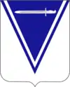 A Silver color metal and enamel device 1 1⁄4 inches (3.2 cm) in height overall consisting of a shield blazoned: Argent, a pile cottised Azure, charged with a sword bayonet fesswise of the field. Attached below and to the sides of the shield a Silver scroll inscribed “RIDENTES VENIMUS” in Blue letters.
