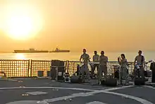 In August 2009 the 34th Infantry Division Band's MPT-D "Hesco Jerks" performed on the Al Basra Oil Terminal located in the Persian Gulf. This performance is the only known musical or "USO" style entertainment event to have been held on the terminal. While on the same mission the band also performed on the USS Decatur (providing security for the oil terminal at the time) marking the first time a US Army Band had performed on a US Navy vessel at sea in support of wartime operations.[24]