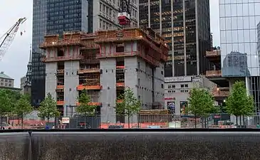 On June 23, 2016, 3 World Trade Center's core was topped out. In a ceremony held at the base of the building, a 2-ton bucket of concrete was signed by workers, and executives, including developer Larry Silverstein, and was hoisted up with an American flag, which was also used with the topping out of 7 and 4 World Trade Center, to the top of the tower.[34] On the evening of August 11, 2016, a construction crane struck one of 3 World Trade Center's windows. There was a heavy wind gust at the time,[35] and construction workers were securing the crane when it veered into a 12th-story glass panel, cracking it. No one was injured.[36]