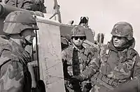 By the fifth day of combat, 28 February, the division had achieved all of its original objectives. It had cleared Objective Dorset after meeting stiff resistance and destroying more than 300 enemy vehicles.[29] The 3rd Brigade, 3AD had also captured 2,500 enemy prisoners.[29][30] The division was now pushing east to block the Iraqi retreat from Kuwait and conduct mopping up operations.[27] Less than one hundred hours after the ground campaign started, President Bush declared a ceasefire.