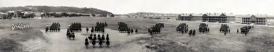 In 1907, the balance of the regiment was reassigned to Fort Meade, South Dakota, while the 3rd Squadron was assigned to Fort Snelling, Minnesota. The 4th Cavalry served on the Mexican border in Texas from 1911 to 1913. For the next six years, the regiment served at Schofield Barracks in the Territory of Hawaii and did not participate in World War I. In 1919, the 4th returned to the Mexican border and patrolled the area near Brownsville, Texas. In 1921, they were transferred to Fort Sam Houston, Texas, and in 1922, the regimental Coat of Arms and Distinctive Unit Insignia were approved by the War Department.[5] In 1925, the regiment returned to Fort Meade, SD, and conducted normal peacetime training and field operations in Wyoming. In 1926, John Philip Sousa, impressed with the 4th Cavalry's reputation, wrote a march for the unit; "Riders for the Flag."[5]