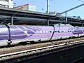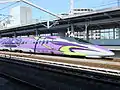 Since 7 November 2015, set V2 runs in a special "500 Type Eva" livery as part of the "Shinkansen:Evangelion Project" tie-up project to mark the 40th anniversary of the Sanyo Shinkansen and the 20th anniversary of Neon Genesis Evangelion.[16] Initially planned to operate until March 2017, this livery was extended until 13 May 2018.[18] From 24 February until 7 May 2018, the 500 series car preserved at the Kyoto Railway Museum will be exhibited in the "500 Type Eva" livery.[19]