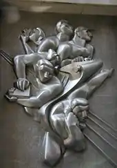 Isamu Noguchi's 10-short-ton (8.9-long-ton) stainless steel panel, News, is located above the building's entrance. His work, which depicts the various forms of communications used by journalists in the 1930s, honors the different occupations in the news industry.[18][19] It is one of Noguchi's last abstract works as well as the only stainless steel work he ever commissioned.[19]