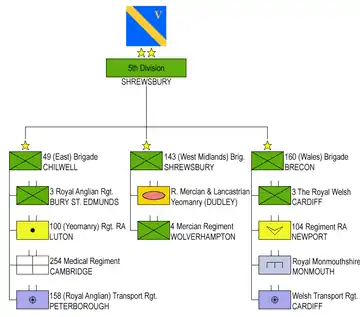 The 5th Infantry Division was a regular army infantry division of the British Army. It was established by Arthur Wellesley, 1st Duke of Wellington for service in the Peninsular War, as part of the Anglo-Portuguese Army, and was active for most of the period since, including the First World War and the Second World War and was disbanded soon after. The division was reformed in 1995 as an administrative division covering Wales and the English regions of West Midlands, East Midlands and East. Its headquarters were in Shrewsbury. It was disbanded on 1 April 2012.