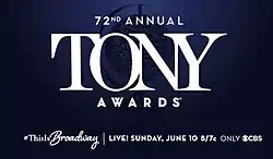 The 72nd Annual Tony Awards were held on June 10, 2018, to recognize achievement in Broadway productions during the 2017–18 season. The ceremony was held at Radio City Music Hall in New York City, and was broadcast live by CBS. Sara Bareilles and Josh Groban served as hosts.[2]