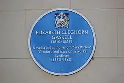 Elizabeth and William, along with their children, Marianne, Margaret Emily "Meta", Florence, and Julia, moved into the house (then numbered 42 Plymouth Grove) in June 1850, after the publication of Elizabeth's first novel, Mary Barton.[13] However, they had lived in Manchester for some time previously as William Gaskell's job of assistant Minister at Cross Street Unitarian Chapel, required the family to move from Knutsford, in neighbouring Cheshire.[14] The family had stayed at two different locations in Manchester, both of which have now been demolished.[14]