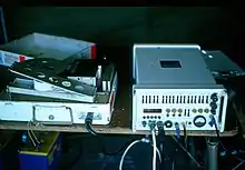 GPS Texas Instruments TI4100 geodetic receiver, corded hand control unit and magnetic tape cassette recorder