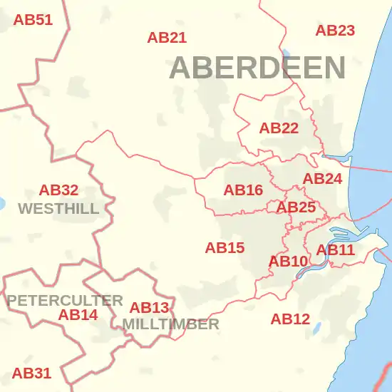 The AB postcode area, also known as the Aberdeen postcode area,[2] is a group of 33 postcode districts in north-east Scotland, within 24 post towns. These cover the Aberdeen council area (including the city of Aberdeen, Milltimber and Peterculter), Aberdeenshire (including Banff, Macduff, Fraserburgh, Peterhead, Ellon, Turriff, Huntly, Insch, Inverurie, Westhill, Alford, Strathdon, Ballater, Aboyne, Banchory, Laurencekirk and Stonehaven) and east Moray (including Buckie, Keith, Aberlour and Ballindalloch).