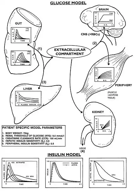 - Lehmann ED, Deutsch T (May 1992). "A physiological model of glucose-insulin interaction in type 1 diabetes mellitus". J Biomed Eng. 14 (3): 235–42. doi:10.1016/0141-5425(92)90058-s. PMID 1588781.