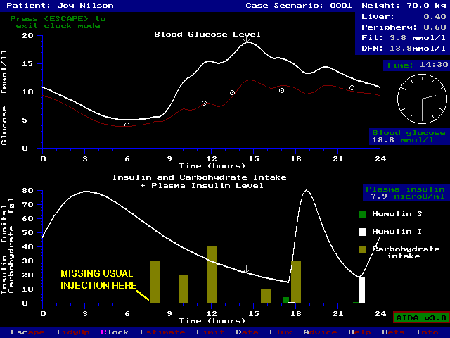 It is important to note that AIDA, like other model-based approaches, is not sufficiently accurate to be used for individual patient simulation or glycemic prediction.[12][13] Therefore, as the program makes clear, it is not intended for insulin therapy planning and can only be used for teaching, self-learning, demonstration, or research purposes. While the AIDA software can simulate a wide variety of insulin dosage and diet (nutrition) adjustments, it should be stressed that the purpose of AIDA is to create a learning environment for communicating and training intuitive thinking when dealing with such adjustments. In this respect AIDA appears most of use for recreating clinical situations in diabetes care — rather than trying to predict best outcome.
