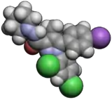 AM-251 is an inverse agonist at the CB1 cannabinoid receptor. AM-251 is structurally very close to rimonabant; both are biarylpyrazole cannabinoid receptor antagonists. In AM-251, the p-chloro group attached to the phenyl substituent at C-5 of the pyrazole ring is replaced with a p-iodo group. The resulting compound exhibits slightly better binding affinity for the CB1 receptor (with a Ki value of 7.5 nM) than rimonabant, which has a Ki value of 11.5 nM, AM-251 is, however, about two-fold more selective for the CB1 receptor when compared to rimonabant.[1] Like rimonabant, it is additionally a μ-opioid receptor antagonist[2] that attenuates analgesic effects.[3]