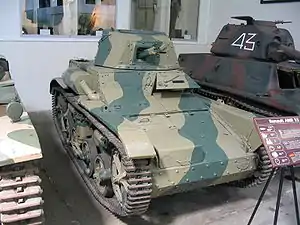 On 10 May, the day of the German invasion, this measure was shown to have been still insufficient. Only 5e DLC had its official strength of 26, the other three divisions having apparently not yet started to make an attempt to increase their strength: 2e DLC fielded 22 AMR 33s, 3e DLC twenty and 4e DLC 23, for a total strength of 91.[11] There was thus a matériel reserve of 22 vehicles.[12] In the Battle of France the type fared very badly. The DLCs in the Ardennes unexpectedly encountered the main German armoured force and could only fight a delaying battle for which the AMR 33 was not very useful. It was poorly armed and armoured – and very unreliable because of its one good point: its speed which wore out the suspension units. It was faster than any German tank of the time. Around 10:00 on 10 May near Vancé, AMR 33 N° 83950 of 3e DLC had the dubious distinction of being the first French tank to be destroyed in the battle, being hit by German anti-tank gunfire, killing the crew. During the first week of the fighting 75% of the AMR 33s was lost, often because of a breakdown.