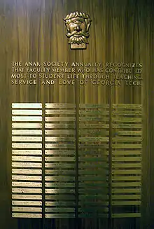 The ANAK Society has donated a number of gifts to Georgia Tech. In 1921, the society donated a staircase connecting Tech Tower to the D. P. Savant Building.[46] The staircase bears a plaque naming ANAK as the benefactor,[47] one of very few conspicuous declarations of the society's existence on the Georgia Tech campus. On September 26, 1947, ANAK presented a life-size bronze bust of Georgia Tech football head coach William A. Alexander to the Georgia Tech Athletic Association to commemorate the society's 40th anniversary.[28] The bust was sculpted by Julian H. Harris, a noted sculptor, architect, and Georgia Tech professor from 1936 to 1972.[48] Along with the Class of 1924, ANAK gifted a portrait of William Henry Emerson, Georgia Tech's first dean, to Georgia Tech in 1924. The portrait was painted by noted Atlanta artist Kate Edwards. After being lost some time in the 1980s, the portrait was found and restored in the early 1990s. It has hung in the atrium of the Lyman Hall Building since October 15, 1992.[49] Along with the Omicron Delta Kappa honor society,[50] ANAK was involved in the dedication of the Paul G. Mayer Memorial Garden on May 30, 1987.[28] The garden, located between the Georgia Tech Library and the William Vernon Skiles Classroom Building, features a plaque bearing the lidless eye symbol of the ANAK Society.[14]