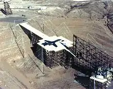 The primary wooden structure of trestle was built inside a natural depression spanning 600 feet across and 120 feet in depth, equivalent to a 12 story-tall building. A wooden ramp 400 feet long by 50 feet wide led to test stand which itself measured 200 feet by 200 feet.[6] A total of 6.5 million board-feet of lumber was used to build the structure,[4] sufficient to support a fully loaded B-52 (then the largest and heaviest strategic bomber in the US inventory) while also minimizing any chance of interference from the ground or the structure itself, creating a reasonable simulation of airborne conditions. A mix of Douglas Fir and Southern Yellow Pine were used for the timbers,[4] as both showed excellent EMP transparency with the former having the best tensile strength and the latter the best weather resistance. By using an all glued laminated timber structure and woodworking joints to mate the giant timbers, with the joints being held together with wooden bolts and nuts, measurements from the EMP tests would not be skewed by large amounts of ferrous material in the structure. Some metal was used in the construction as critically loaded joints incorporated a circular steel sheer ring that surrounded the wooden bolt clamping the joint. Even the fire escape along one side of the trestle and the whole of the extensive fire suppression piping were constructed of fiberglass.