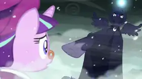 ![]() In the story within a story, the Spirit of Hearth's Warming Yet to Come (right, represented by Princess Luna) warns Snowfall Frost (represented by Starlight Glimmer) of the tragic outcome of her actions. | |