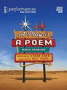 A Play Is A Poem is a collection of five one-act plays written by Oscar-winning screenwriter Ethan Coen which features original music written by Nellie McKay.[1] The play had its world premiere at Center Theatre Group's Mark Taper Forum in 2019. The play began previews on September 11, 2019 and officially opened on September 21, 2019. The production played through October 13, 2019 and was set to begin performances at The Atlantic Theatre Company's Atlantic Stage 2 on May 14, 2020 but is currently postponed due to the COVID-19 Pandemic.[2]