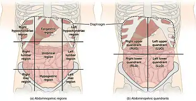 The abdomen can be divided into quadrants or regions to describe the location of an organ or structure. Classically, quadrants are described as the left upper, left lower, right upper, and right lower. Quadrants are also often used in describing the site of an abdominal pain.[12]