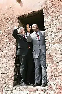 Wade subsequently spent a year in France, returning to Senegal on October 27, 1999.[19][20] In the first round of the 2000 presidential election, held on February 27, he again took second place, receiving 31% of the vote, but for the first time, Diouf did not win a first round majority,[10] and consequently a second round was held on March 19. Wade won this round with 58.49% of the vote,[10][21] having received the support of candidates from the first round, including third place candidate Moustapha Niasse. Wade became President on April 1, 2000 and appointed Niasse as his Prime Minister shortly afterwards.[21] Wade initially cohabited with the PS, which held a majority in the legislature until the PDS and its allies (the Sopi Coalition) won a majority in the April 2001 parliamentary election.