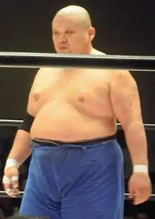 Yōsuke Kobayashi (小林 洋輔, Kobayashi Yōsuke) (born July 22, 1976),[4] is a Japanese professional wrestler best known by his stage name Abdullah Kobayashi (アブドーラ小林, Abudōra Kobayashi) after Abdullah the Butcher, who was his trainer. He began his career in 1995 as one of the main wrestlers in Big Japan Pro Wrestling in the Deathmatch division and has wrestled for Big Japan Pro Wrestling throughout most of his career.[1] He is well known for his very brutal deathmatches with the likes of Ryuji Ito and several other BJW wrestlers. On June 26, 2010, Kobayashi made his American debut in Combat Zone Wrestling's Tournament of Death IX defeating Nick Gage in the first round but lost in the second to JC Bailey. In mid-2013, Kobayashi was diagnosed with hepatitis C, forcing him to take a long-term break from in-ring action to undergo treatment.[5] He returned to the ring on August 10, 2014.[6]