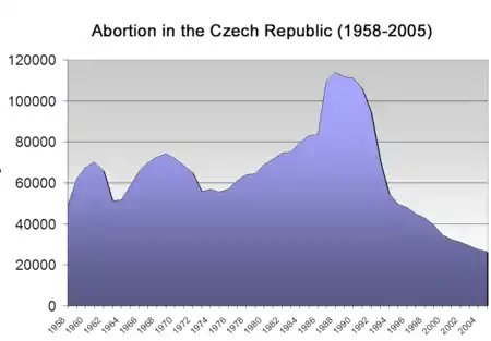 In 1957 abortions were legalized in Czechoslovakia, although with restrictions that depended on the current policy of the government. In 1986 the restrictions were lifted resulting in growth of the number of abortions.