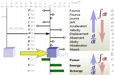 ![]() When an object moves, its motion can be described by the integrals of displacement, including absement, absity, abseleration, etc., as well as the derivatives of displacement, including velocity, acceleration, jerk, jounce, etc. | |
